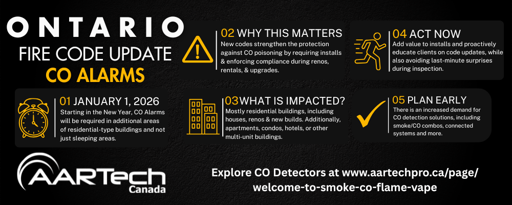 For installers, this means there is an increased demand for combination smoke/CO units, interconnected alarm systems, and multi-unit-friendly solutions. This also means that, after January 1, 2026, installers can expect increased scrutiny from AHJs, with a particular focus on carbon monoxide protection during inspections. Stay ahead and prepare for upcoming assessments with guidance from Aartech Canada.